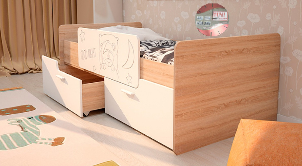 Купили сыну 1год и 8мес. Искали бюджетный вариант, эта модель шла со скидкой. Доставили уже через день. Доступная инструкция, собрали сами. Кровать добротная, очень вместительные ящики на колёсиках, легко выдвигаются. Матрас заказали здесь же, ортопедический Бемби(мне кажется немного жестковат, но это даже хорошо для спины). Ребёнку понравилась кровать.Покупкой довольны.