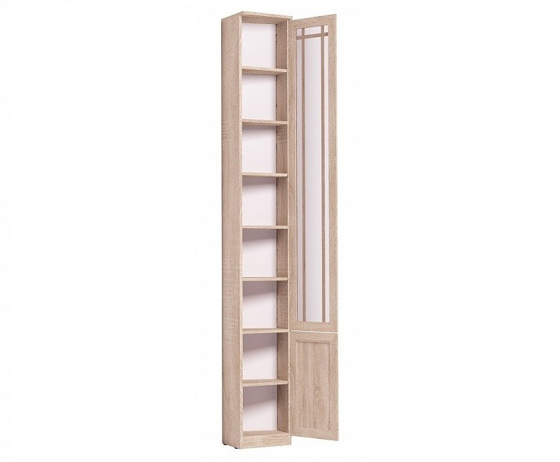 Высокий шкаф с полками и комбинированным фасадом станет незаменимым элементом в гостиной, библиотеке или рабочем кабинете. Модель скошенная, и глубина зауженной частисоставляет всего 17 см! Наполнение шкафа - регулируемыеполки, которые Вы можете установить на удобной для Вас высоте. Максимальная нагрузка на одну полку - 13 кг. Тонированное стекло на фасаде защитит все Ваши книги и предметы декора от вредного воздействия солнечных лучей. Для максимальной безопасности модуль крепится к стене за подвесы, с другими шкафами скрепляется межсекционной стяжкой. Особенности ЛДСП 16 мм, профиль МДФ, кромка ПВХ тонированное стекло 4 мм декор "дуб сонома" комплект регулируемых по высоте полок обязательное крепление к стене за подвесы правый скос