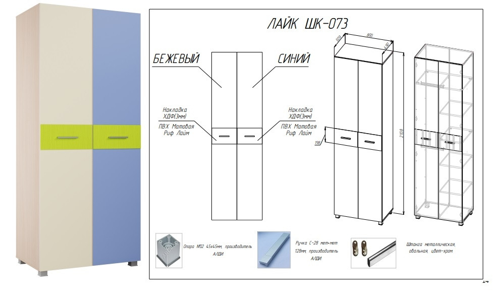 • Материал: ЛДСП 16мм/МДФ 10мм/Накладки на фасадах выполненные из ХДФ толщиной 3мм облицованного пленкой ПВХ Матовая Риф Лайм.